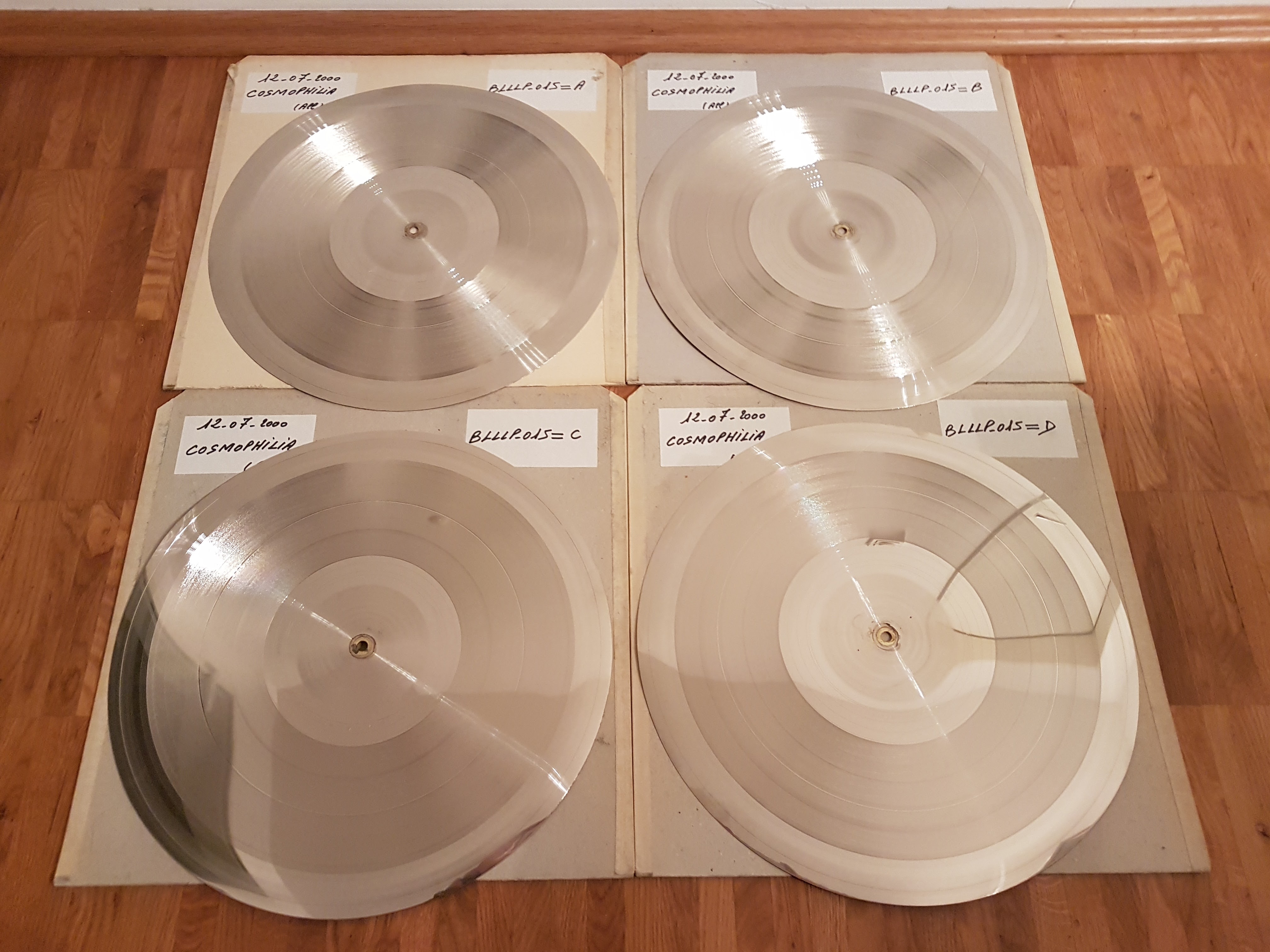 FOR SALE! ABSOLUTELY UNIQUE COLLECTOR'S ITEM! What is it?! You're looking at the MASTER discs of the Asia 2001 album 'Dreamland', released as vinyl on Balloonia Ltd., with the Cat. Nr. BALLLP015, back in the year 2000. See here for more details: http://www.discogs.com/Asia-2001-Dreamland/release/144242 The music has been cutted into these discs. From these discs negative discs have been made. These negatives have been used for pressing the final vinyls. That means these exist only ONCE, which makes them absolutely unique! The album had 2 discs, that's why you see 4 master discs here (one for each side of the 2 discs). This is an outstanding collector's item and should make every Asia 2001 über happy! Since they exist only once it's hard to put a price tag on it. So I stick with, make me an offer I can't refuse and they are yours! Send me a private message with your offer! By common grading standards, the condition is NM (Near mint). You could play them on any turntable but that's definitely not recommended. For example I got some other master discs in my living room hanging on the wall (Iboga 001 and Digital Structures 001). Of course I sell all 4 master discs together only!
